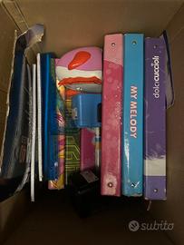 Vendo in blocco materiale scolastico quaderni,fogli di ricambio,flauti,quadernoni ad anelli,copri quaderni temperino elettrici flauti calcolatrici squadre righelli in foto alcuni pezzi perché non stanno tutti vendo a 50 euro non trattabile