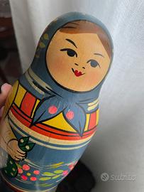 Matrioska originale U.R.S.S. – completa 9 pezzi dipinti a mano Matrioska autentica proveniente dall'Unione Sovietica. Presente anche il più piccolo che di solito viene perso. Stile essenziale tipico sovietico. Colori caldi, volti semplici ma espressivi. In buone condizioni generali, con qualche sbeccatura (normali segni del tempo). Sul fondo della bambola più grande è presente la stampa "Made USSR" (Unione Sovietica), dato distintivo dell’originalità e dell’epoca, non, dunque, classico souvenir.