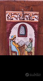 Mattone in ceramica Deruta su legno " La Professoressa". Mattone stampato a mano. Dipinto a mano. Base in legno anticata. Misure: 38x23 cm. Prezzo 70 euro.
