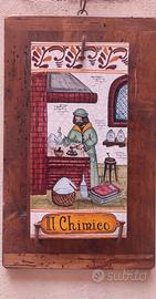 Mattone in ceramica Deruta su legno "Il Chimico". Mattone stampato a mano. Dipinto a mano. Base in legno anticata. Misure: 38x23 cm. Prezzo 70 euro.