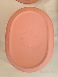 È un set composto da due pezzi, una base ovale e un coperchio a cupola, realizzato in terracotta porosa non smaltata.