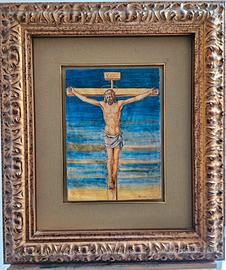 Mattonella in ceramica con Cristo in croce dipinta a mano.