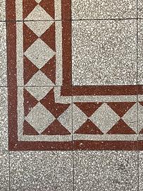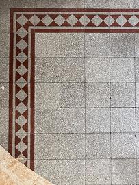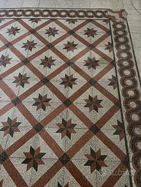 Mattonelle in graniglia in tre diversi disegni. Pavimento in graniglia decorata dei primi anni del '900,. Il pavimento ricopre una superficie di 6,7 mq e di 15 mq (sono due disegni diversi come in foto) e sono composti da una cornice completa di angoli e una decorazione centrale "a tappeto". Dimensioni singola mattonella 20x20. La terza tipologia è un pavimento composto da 54 pezzi disposti a cornice ( 14x14 mattonelle, inclusi i 4 angoli). Dimensioni singola mattonella 20x20.