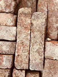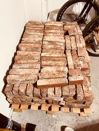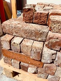 250 mattoni in cotto antico datati circa 1800 provenienti da un casale dismesso della Tuscia. I mattoni sono stati tagliati a metá con lama diamantata ed hanno dimesioni di circa 20 cm x 8 cm x 8 cm per rivestire una parete interna. Le dimensioni variano di qualce cm da mattone a mattone per la natura artigianale del prodotto originale, il taglio longitudinale è eseguito esattamente a metá.