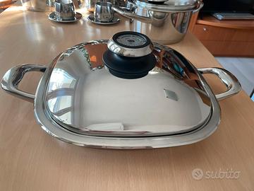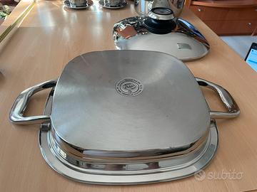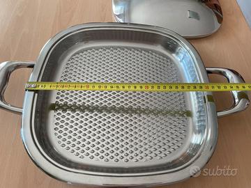 AMC BISTECCHIERA ARONDO MAXI 2,2LT SERIE 30 Arondo/ bistecchiere AMC, nota per il suo fondo speciale a forma di nido d'ape che permette di grigliare in modo sano e senza fumo, sia a casa che all'esterno. È progettata per grigliare carne, pesce e verdure, grazie a un design che drena i liquidi e massimizza l'effetto griglia, mantenendo il cibo tenero all'interno e croccante all'esterno. Capienza 2,2lt, diametro 32cm, modello M30 .Usata, adatta per tutti piani di cottura anche per induzione