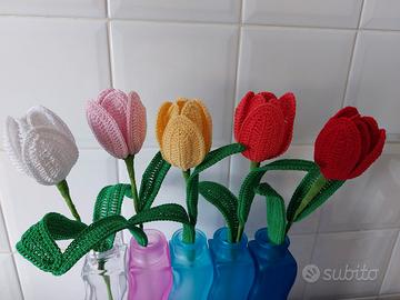 Mazzo di 5 tulipani fatti a mano ad uncinetto, ogni fiore è composto da 6 petali con all'interno stami e pistilli e 2 foglie altezza circa cm 35, si possono avere di un colore a vostro piacimento, tutti diversi o tutti uguali ,i fiori costano 7 euro l'uno se ne possono prendere quanti ne volete, (vasi esclusi) consegna a mano a Genova eventuale spedizione a vs carico