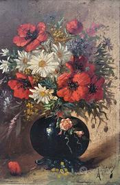 Vendo un dipinto originale a olio su tavola, raffigurante un mazzo di fiori con papaveri come fiori di campo, in stile XVIII secolo, opera risalente ai primi anni del XX secolo.