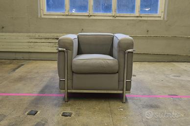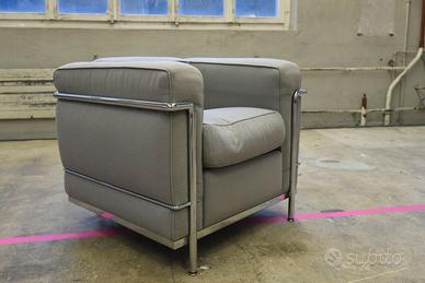 Magnifica poltrona modello LC2 con rivestimento in mobido cotone dalla sublime qualità tattile ed estetica. Manufatto disegnato nel 1928 da i tre geniali architetti parigini: Le Corbusier e Pierre Jeanneret, Charlotte Perriand. Struttura in acciaio tipo Mannesman a specchio. Cuscini ben allineati e ben compatti.