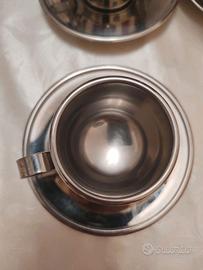 Meber servizio tazze termiche in acciaio inox 18/10 Made in Italy completo di 12 tazzine e 12 piattini, set in ottime condizioni con sola necessità di lavaggio, struttura classica in acciaio inox 18/10.