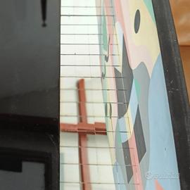Legno laccato nero, specchi, ripiani con rivestimento metallico e fronte dipinto a mano
