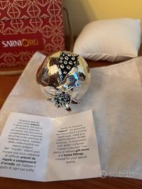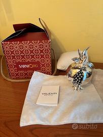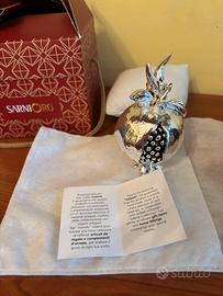 Elegante oggetto decorativo a forma di melograno firmato Valenti, realizzato in Italia con raffinata finitura argentata lucida. Il design curato nei dettagli, con semi neri a contrasto visibili all’interno, lo rende un complemento d’arredo ideale per impreziosire qualsiasi ambiente, dal classico al moderno. Perfetto come idea regalo simbolica (il melograno è segno di prosperità e fortuna). Nuovo con cartellino e scatola originale SarniOro, altezza 10 cm circa, laminato argento. Prezzo 18€.
