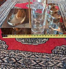 Bellissimo menage da tavola in acciaio inox 18/10 Inoxpran completo di contenitori in vetro per olio, aceto, sale, pepe, stuzzicadenti e formaggio con coperchio. Usato ma in ottime condizioni, solo qualche segno di calcare.