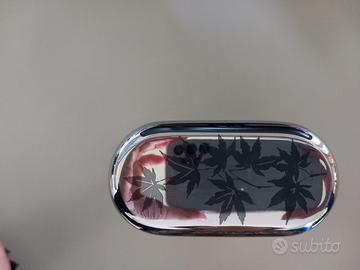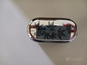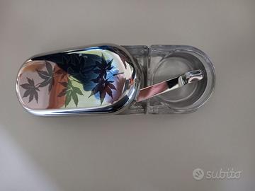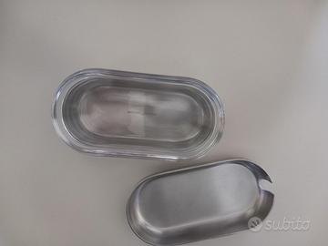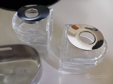Menage per la tavola elegante composto da contenitore olio e aceto, sale e pepe, porta formaggio, in acciaio inossidabile effetto specchio e cristallo, collezione graffiti, marca Sambonet, mai usato
