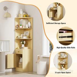 3.**Salvaspazio:** Questa mensola angolare a 3 livelli con 1 cassetto e 1 armadietto è estremamente versatile e può essere utilizzata come scaffale espositivo o libreria angolare, perfetta per qualsiasi piccolo angolo o posizionata da sola in qualsiasi stanza.I suoi pannelli laterali sono progettati per evitare la caduta degli oggetti.