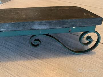 Mensola antica in ferro con piano d’appoggio in marmo verde da utilizzare anche all’esterno. Predisposta con fori per inserire i tasselli.