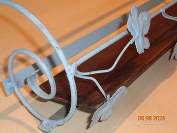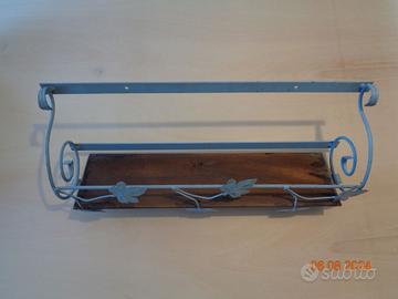 Cedo per motivi di spazio, al modico prezzo di € 15,00, originale mensola portaoggetti da parete in ferro battuto, decorata con motivo vegetale. Le misure di ingombro massimo (in cm) sono: 60,5 x 14 x 23 (altezza), mentre la sola mensola di legno misura approssimativamente (in cm): 54 x 15 x 3 (altezza). E' adatta ad essere utilizzata in casa come portaoggetti, da collocare per esempio in cucina o in bagno. Condizioni generali come da foto. Non spedisco, solo consegna a mano.