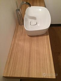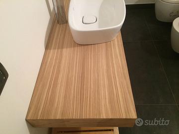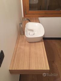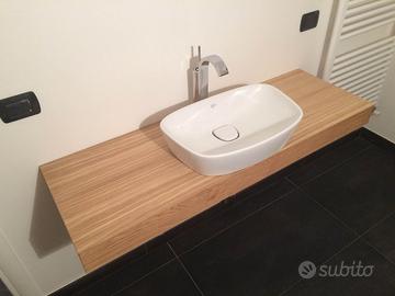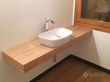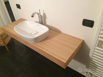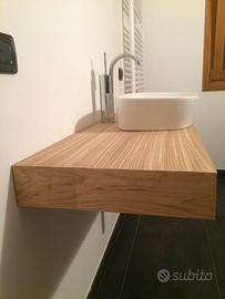 Mensola da bagno in rovere spazzolato con misure lungh.150 prof.43 h 10cm costruita con pannello interno in multistrati e legno applicato attorno in modo da avere una superficie liscia e uniforme in modo che nel tempo non abbia problemi e lastronato a 3 strati con essenza di rovere in tutte i 2 i lati con cartelle da 7 mm sotto e sopra. fascia applicata sotto tutto spazzolato. supporto sotto al piano costruito su misura con staffa in ferro quadrato e piastra da applicare al muro, regolabile in modo da mettere a bolla la mensola per poi applicare in vs lavello d'appoggio. nel prezzo è compreso la finitura trasparente impermeabilizzante per bagno franco fabbrica. escluso lavello miscelatore e iva. mensola costruita su commissione del cliente non teniamo magazzino ma essendo i diretti produttori possiamo riprodurla uguale o su specifica del cliente. per dubbi e chiarimenti contattateci direttamente dal falegname costruttore. ASTENERSI RIVENDITORI E COMMERCIANTI