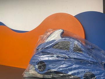 Vendo due mensole modello onda in legno per cameretta bimbo, completi di ganci e viti con chiusura macchinina e delfino (tutto in legno). Color arancione e blu.