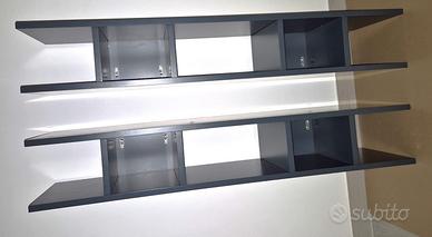 Vendo causa trasloco due composizioni di mensole sospese a muro color grafite con vani a giorno. Possono essere utilizzate come librerie da parete sia in ambiente soggiorno, ingresso o per una camera da letto per ragazzi. Dotate di staffe di aggancio a muro in orizzontale. Dimensioni: Lunghezza: 120 cm Altezza: 20 Cm Profondità: 28 cm - Prezzo 1 libreria: 25 Euro - Prezzo 2 librerie: 40 Euro Non spedisco solo ritiro a mano Roma, Zona Petrocelli (uscita GRA 21)