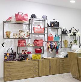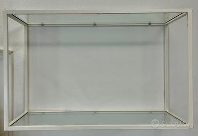 Vendo espositore da muro con struttura bianca e mensole in vetro