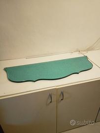 Mensola in ferro battuto dorato con ripiano in vetro color verde acqua marina spesso 15mm misure del vetro lunghezza 94cm altezza 34 cm altezza struttura in metallo 81cm.