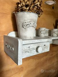 Mensola in legno con fregi a rilievo dipinta e decorata a mano in stile Shabby Chic.