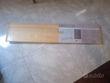 Mensola in pino non trattato, ancora impacchettata, completa di supporti anch'essi in pino e delle viti e fisher per il fissaggio. Misure 90x1,8x20 Colore marrone chiaro naturale