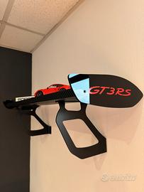 Mensola ispirata all’alettone della PORSCHE GT3RS. Staffe realizzate in acciaio verniciate a polvere, fianchetti in plexiglas nero lucido tagliati a laser. Modello carbonlook ( pellicola professionale hexis messa da wrappatore professionista)e colore della scritta ( arancione, bianco, giallo o blu)