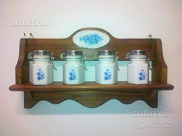 mensola portaspezie, lavorazione artigianale in legno massello, colore noce, finitura cerata, dimensioni cm. 40x20x8 mensola decorata euro 35,00 Mensola liscia euro 30,00 i vasetti portaspezie sono a scopo dimostrativo non compresi nel prezzo.