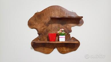 Le mensole da muro sono realizzate con pregiate radiche di noce nazionale, caratterizzata da forme organiche e irregolare, utilizzando sezioni naturali del tronco. Non vendibili separatamente.