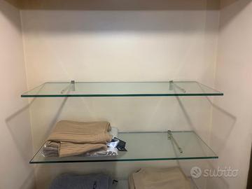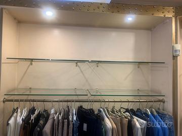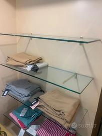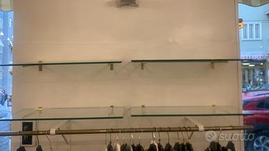 Vendo lotto di mensole in cristallo da negozio abbigliamento. Supporti a muro inclusi, colore oro/ottone e cromo. Varie misure. Ottime per negozio, showroom o uso domestico. Usate, in buone condizioni, nessun cristallo rotto. Provengono da negozio in chiusura. Ritiro a Roma, no spedizione. Prezzo 20 a mensola, trattabile sul lotto.