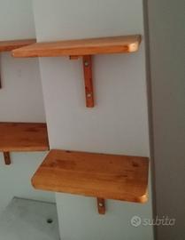 vendo mensole in legno da muro con staffe in bambù. Una coppia di mensole (le più lunghe) ha misure sfalsate: 135x39x18x1,7 . l'altra è più piccola e regolare: 30x16,5x1,7. sono state tutte levigate e trattate con vernice.