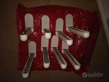 Vendo 4 mensole celesti in legno lucido e 8 reggi mensola in acciaio (2 per mensola) con 8 copri reggi mensola in plastica bianca.