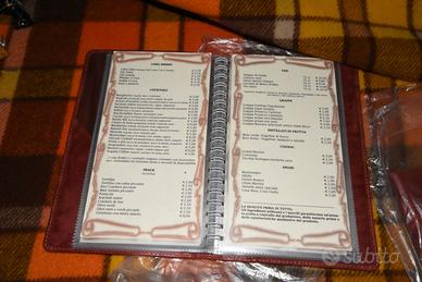 7 porta menu in vera pelle con contenitore in plastica per inserire l fogli per le pietanze N°7 PEZZI PORTA MENU' IN VERA PELLE, FATTI FARE ARTIGIANALMENTE NOTA DITTA DI PELLAME CON INTERNI IN PLASTICA MISURA 30 DI ALTEZZA E CIRCA DI 16 LARGHEZZA NEL BLOCCO DI PLASTICA CI SONO 7 FOGLI