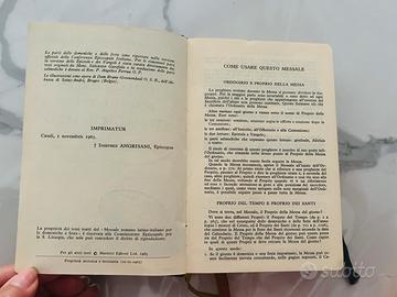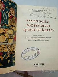 è un'edizione del Messale Romano Quotidiano curata da Dom Gaspare Lefebvre, monaco benedettino dell'Abbazia di Saint-André. Questa specifica versione è stata pubblicata da Marietti, editori pontifici, ed è un'edizione autorizzata dalla Conferenza Episcopale Italiana (CEI). Il "Messale di Lefebvre" è stato per decenni lo strumento principale per permettere ai fedeli di seguire la liturgia. Contenuto: Include i testi della Messa per tutto l'anno liturgico, spiegazioni dottrinali e vite dei santi. Periodo Storico: La dicitura "Edizione autorizzata dalla CEI" e il timbro della Biblioteca Cappuccini di Casalmaggiore suggeriscono che questa copia risalga al periodo di transizione post-conciliare (attorno alla fine degli anni '60), quando si iniziò a introdurre la lingua italiana nella liturgia. Curiosità sulla copia La nota manoscritta in alto “Ad uso di..." suggerisce che questo messale non fosse solo un libro da scaffale, ma uno strumento di preghiera quotidiana "personalizzato" per la suora, rendendolo un pezzetto di storia devozionale locale. Provenienza: Il timbro blu circolare appartiene alla Biblioteca dei Cappuccini di Casalmaggiore, confermando la provenienza del volume da un fondo religioso locale. Ottimo stato a parte la copertina frontale danneggiata da adesivi ma perfettamente rigida ed integra. Circa 1500 pagine.