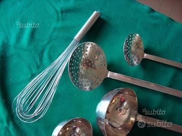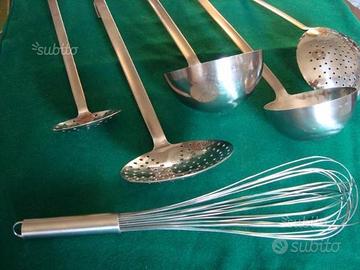 Vendo 6 pezzi tra mestoli,ramaiole,schiumarole e una frusta professionali della famosa marca tedesca Rösle. Sono tutti nuovi,in acciaio 18/10 con manico a sezione rettangolare e lunghezza da 41 cm. fino a 50cm. Idale per cucine di ristoranti,hotel,comunita' o anche per un differente e originale regalo