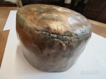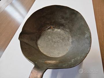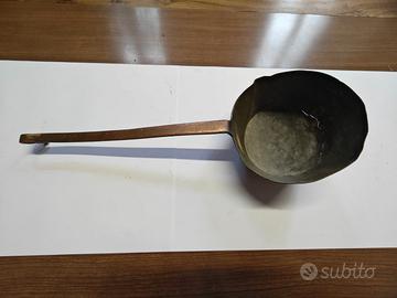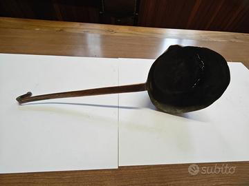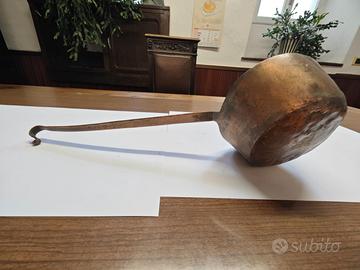 Mestolo antico in rame del XX secolo, mestolo per conserve, utensile in rame fatto a mano, mestolo da cucina in rame battuto e stagnato realizzato a mano. Questo oggetto è un antico ramaiolo o mestolo, tipicamente realizzato in rame, utilizzato in passato per attingere liquidi da grandi recipienti. Presenta segni di usura dovuti all'uso e al tempo ben visibili nelle foto. Va restaurato. Dimensioni: lunghezza 42 cm., altezza 7 cm., diametro 14 cm., peso kg. 0,330.