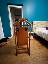 Pratico e funzionale, ha due spalle per appendere giacche e camicie, una staffa porta pantaloni e un'altra con ganci regolabili per appendere le gonne, vaschetta porta oggetti con ganci per appendere cravatte e cinture, una comoda base porta scarpe e ruote piroettanti antigraffio per facilitare gli spostamenti.