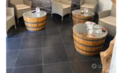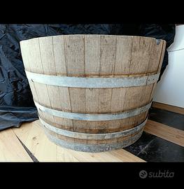Mezza botte di vino, probabilmente era tra i 450 e 500 litri. Doghe in legno massello, credo sia rovere. Tenuta discretamente, da lavorarci un po' per portarla ad uno stato piacevole e desiderato, oppure da tenere così com'è nello stato grezzo e originale. Le misure sono circa di cm 57,5 per l'altezza esterna e di cm 89 per il diametro esterno superiore. Presumibilmente il peso si aggira intorno ai 35 Kg. Ideale per trasformarla in una grande fioriera, magari per una palma, oppure in tavolino da Lounge.