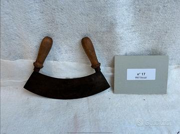 Mezzaluna da cucina vintage con lama in metallo brunito e doppi manici in legno tornito. Utensile tradizionale per tritare, risalente alla prima metà del ’900. In buone condizioni, con segni del tempo che ne testimoniano l’uso. Colori: metallo scuro e legno naturale.