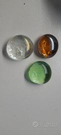 Sacchetti Mezze biglie o cabochon in vetro trasparente. Totale sacchetti: 4 bianchi trasparente con effetto iridescente e non, 5 verdi, 3 ambra. 1 da 500gr con cabochon tondo e allungato (tipo biscotto plasmon) sempre trasparente