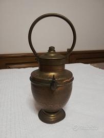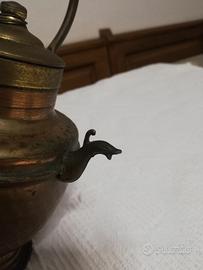 Mezzina toscana in miniatura, realizzata in rame e ottone dei primi del '900. Il corpo è in rame, martellato a mano, le finiture sono inottone. È alto circa23 cm. All'epoca veniva usato come oggetto decorativo. Beccuccio a forma di testa di pesce. Coperchio raccordato al manico, in ottone, tramite una sottile catena. Inottime condizioni conservative, con una patina naturale che ne attesta l'età. Da collezione.