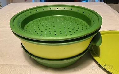 Cucina A Microonde a vapore. Facile da pulire. Lavabile in lavastoviglie.Il Cottura a vapore a 2 livelli: i due Scolapasta permettono di cuocere simultaneamente carne, pesce, verdure e/o frutta a vapore. Lo Scolapasta inferiore e il Coperchio vapore sono dotati di uno scudo metallico che impedisce il passaggio delle onde durante la cottura a vapore.Cm 13,7 diametro, h 26,5 Capacità 2,25 lt A scelta con 5 euro, fornito con i 8 pirottini originali.