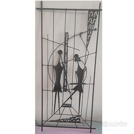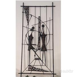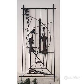Descrizione: Scultura murale in ferro battuto modernista, Italia anni ’60. Composizione figurativa in tondino saldato con forte presenza plastica e lettura dinamica dello spazio.
