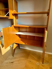 La struttura è realizzata in teak massello e impiallacciato, scelto per la sua tonalità calda e la venatura ricca e naturale. Il sistema è composto da 4 moduli e 5 ripiani regolabili, che permettono numerose configurazioni per accogliere libri, opere d’arte e oggetti decorativi. Le proporzioni e il ritmo dei montanti verticali conferiscono al mobile una presenza forte ma allo stesso tempo leggera, tipica dell’arredo modernista italiano di alta qualità.