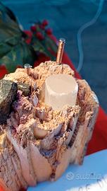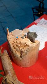 Un piccolo altare decorativo fatto a mano composto da cristalli di Selenite e Tormalina Nera dalla spagna. incastonati in una sezione di tronco di legno rotta in punti strategici per somigliare ad una montagna, vediamo due bobine di filo di rame connesse ai due minerali che fungono da amplificatori per l'energia di questi.