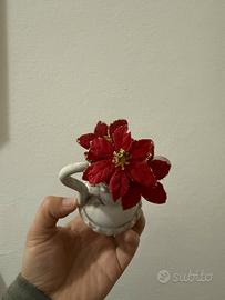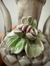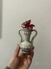 Vendesi delizioso mini-vaso a forma di anfora in ceramica artigianale. Un oggetto dal fascino senza tempo, perfetto per amanti del vintage o come bomboniera/elemento d'arredo shabby chic. • Dettagli: Caratterizzato da una finitura bianca "antichizzata" con patinatura grigia che ne risalta i rilievi. Presenta un raffinato fiore in rilievo (applicazione 3D) sui toni del verde e del rosa antico sulla parte frontale. • Stile: Classico / Shabby Chic. • Dimensioni: Tascabile/Mini (perfetto per piccoli angoli, mensole o come segnaposto). • Condizioni: Ottime, nessuna sbeccatura evidente (come da foto). • Nota: Il decoro natalizio rosso all'interno è incluso/removibile.