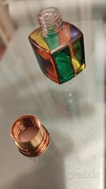 Mini bottiglia per profumo/olio essenziale mignon, vetro murano colorato, con tappo a vite. Vintage anni '60. Si segnala qualche imperfezione al colore dovuta al trascorrere del tempo. Misura altezza cm 5.