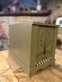 Dipinta in una raffinata tonalità verde salvia, è decorata a mano con motivi floreali e piccoli alberi stilizzati che le donano un irresistibile gusto country / shabby.