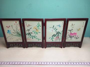 Mini paravento decorativo a quattro ante, perfetto come complemento d'arredo per scrivanie, librerie o angoli "zen". Cornice in legno laccato e cerniere in metallo dorato.